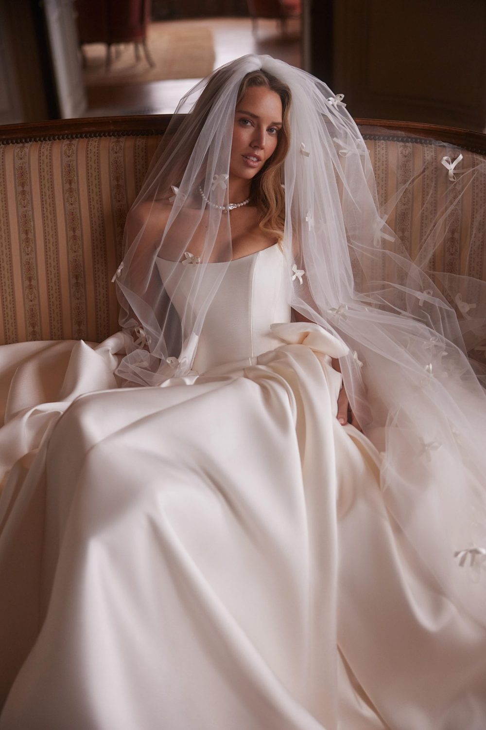 Cassia je haljina koja spaja vanvremensku eleganciju sa savremenom senzualnošću. Sa izraženim ramenima i raskošnim preklopom koji pada u nežne drapirane slojeve, ova silueta savršeno prati liniju tela i otkriva nogu kroz visoki šlic. Bogata tkanina nežno reflektuje svetlost i dodaje luksuznu notu svakom pokretu, dok dugačka, čista suknja sa šlepom daje dramatičan efekat iz svakog ugla. Idealna je za mladu koja želi sofisticiran izgled sa dozom smelosti.