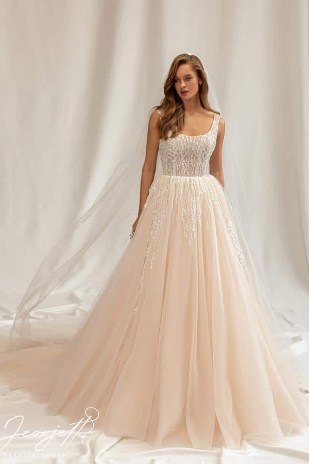 Leona is a stunning gown in a nude shade, featuring an impressively magnificent top and a luxurious, voluminous skirt that creates a fairytale-like appearance. The design is highlighted by several accents, including a wide collar that enhances the neckline, accented with a special nude insert. The gown is adorned with luxurious 3D appliqués, embroidered sequins, and pearls. The skirt is embellished with sparkling glitter, completing this enchanting and magical look.