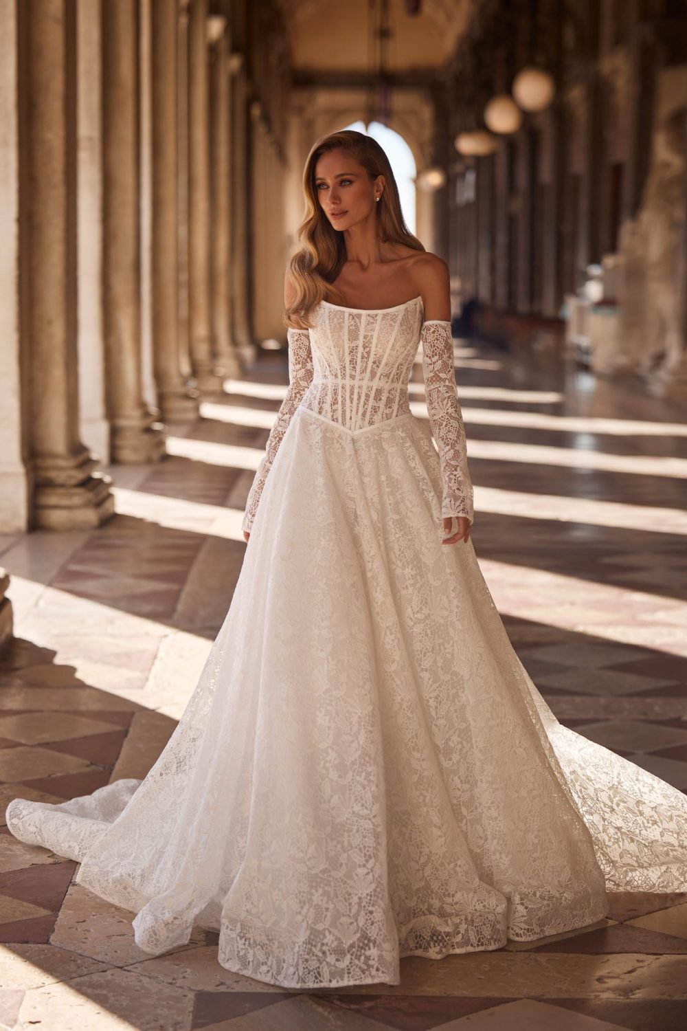 Ravena je raskošna u svojoj jednostavnosti — izrađena od luksuznog mikado svile, ova haljina odiše sofisticiranošću. Strukirani korset nežno oblikuje siluetu, dok voluminozni donji deo kreira dramatičan, ali klasičan izgled. Ravena dolazi sa dve varijante bretela: delikatne trake koje se vezuju u romantične mašne ili čist, bez naramenica kroj za moderne neveste.